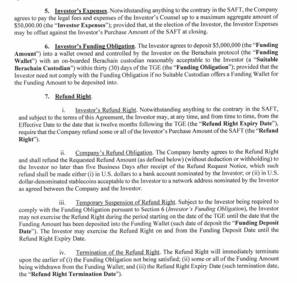 Four crypto-focused attorneys told Unchained that such arrangements are highly unusual in token fundraises, where refund rights typically only trigger if projects fail to launch tokens at all.