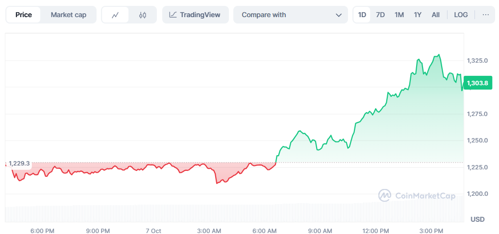 The breakout didn’t go unnoticed by algorithmic traders. Once the $1,200 threshold fell, long positions surged across major derivatives platforms. Simultaneously, over $18 million in leveraged shorts were liquidated, marking a 7-day high in short liquidations and adding fuel to the price rally.