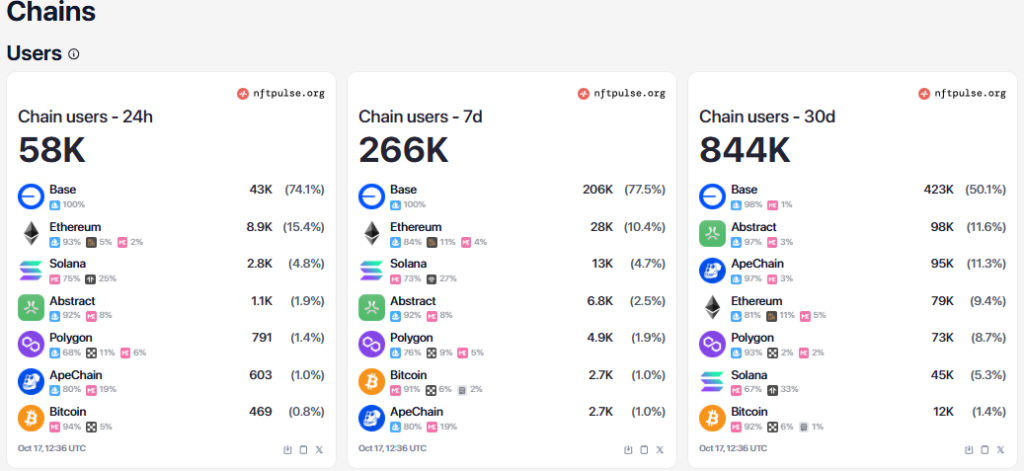 Base, Coinbase’s Layer-2 network, now dominates NFT activity, accounting for more than half of total transactions across blockchains, followed by Ethereum, Polygon, and Solana.