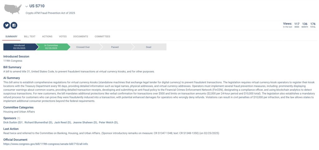 Introduced in the U.S. Senate as Bill S. 710, the Crypto ATM Fraud Prevention Act of 2025, which has been read twice and referred to the Senate Committee on Banking, Housing, and Urban Affairs, is designed to reduce fraud risks while increasing transparency for consumers.