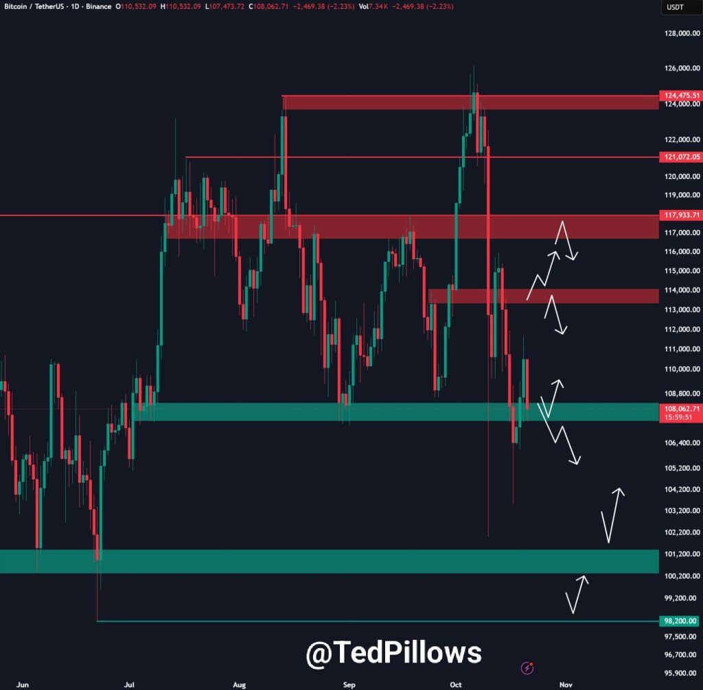 “If Bitcoin loses the $107,000 level, it could drop towards $100,000,” trader TedPillows said.