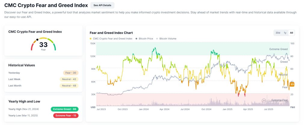 Meanwhile, the crypto market sentiment remains in the fear zone, with only a slight improvement since yesterday. The Crypto Fear and Greed Index stands at 33, up from 30 the previous day but still signaling cautious investor behavior.