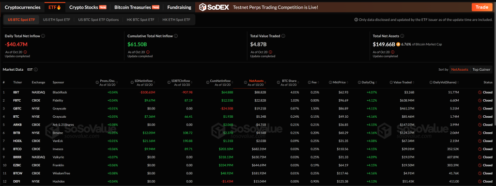 The US Bitcoin spot exchange-traded funds (ETFs) recorded another day of outflows on October 20, totaling $40.47 million in net redemptions. The day’s trading volume across all issuers reached $4.87 billion, while cumulative net inflows since launch remain strong at $61.50 billion.
