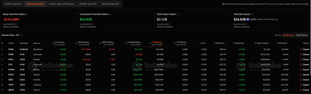The US Ethereum spot ETFs also saw heavy outflows on October 20, totaling $145.68 million, marking one of the largest single-day redemptions since launch. Total trading volume across all ETH spot ETFs reached $2.15 billion, while cumulative net inflows remain positive at $14.45 billion.